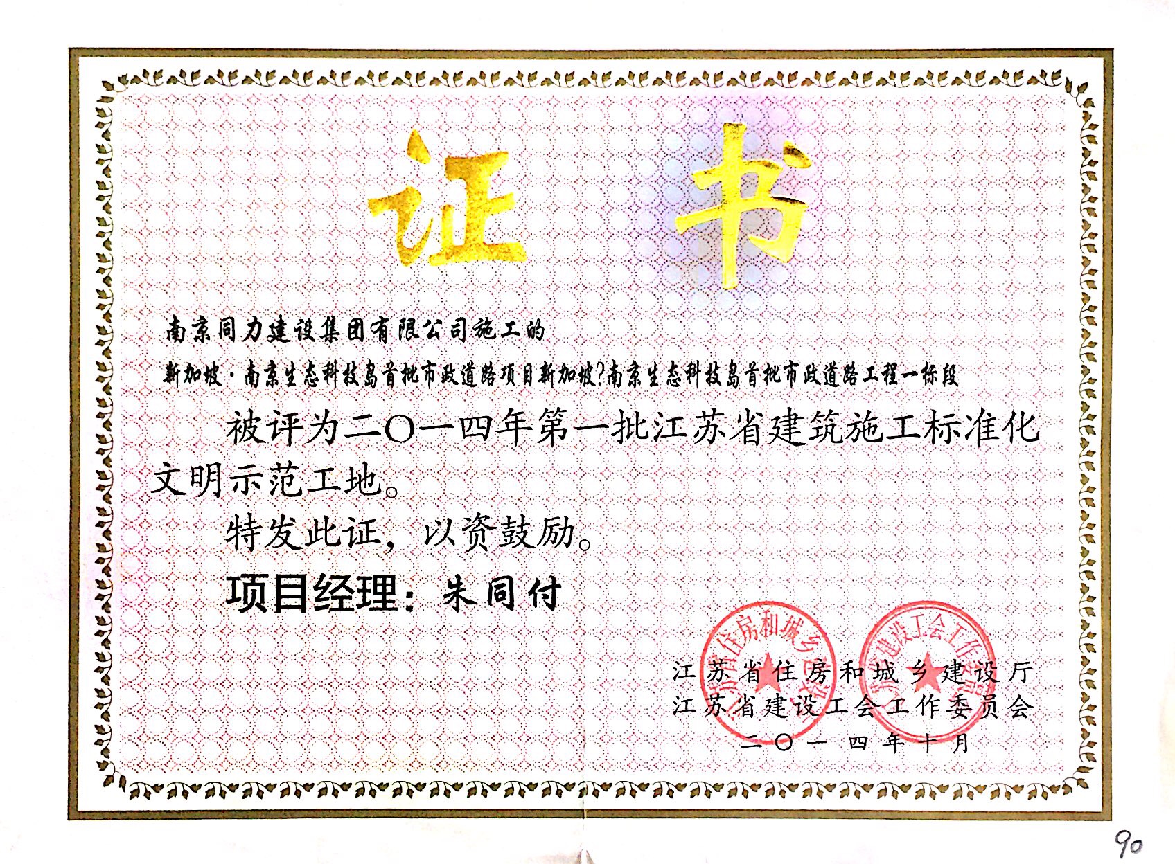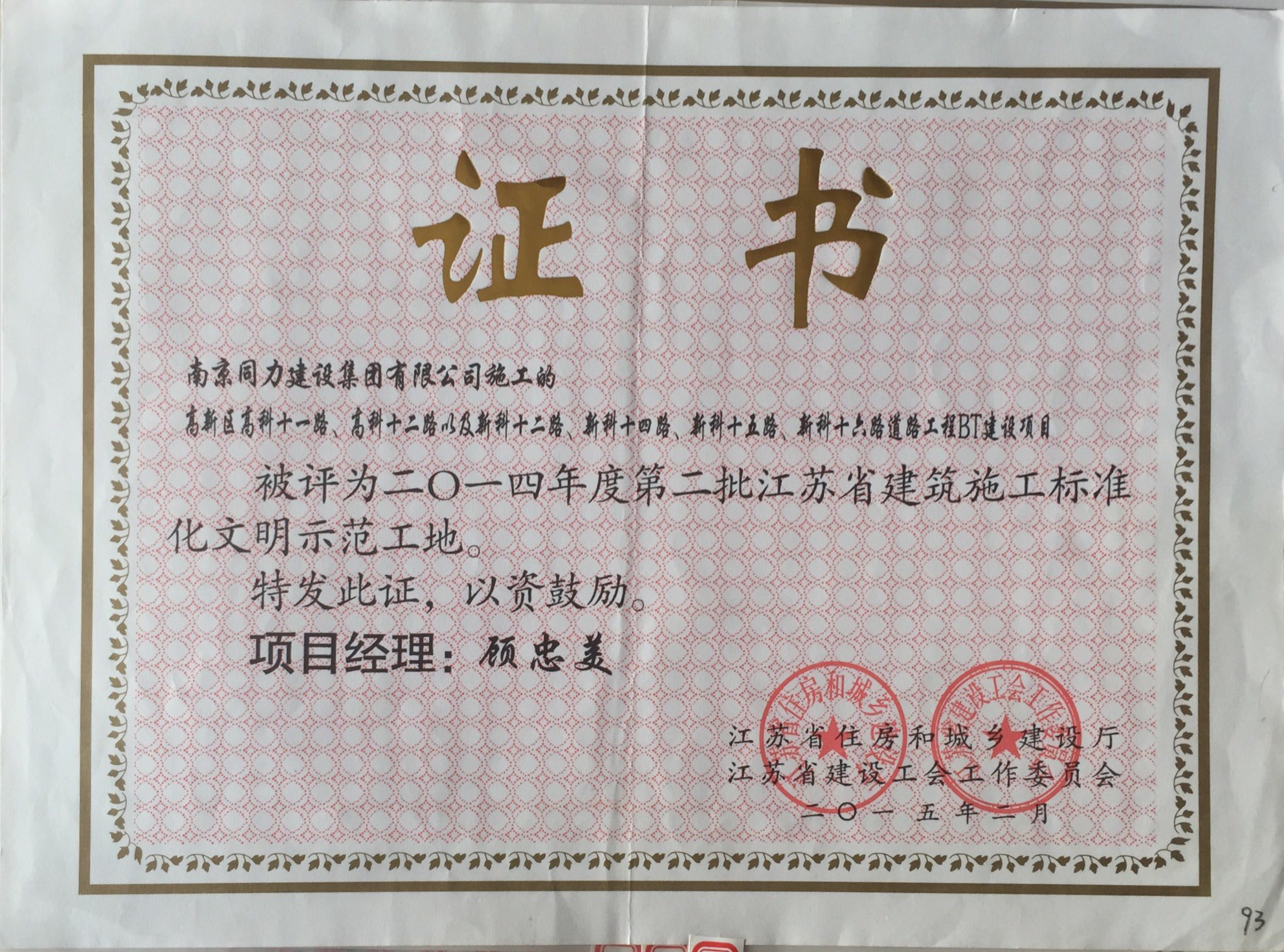 公司荣获2014年度江苏省建筑安全与设备...