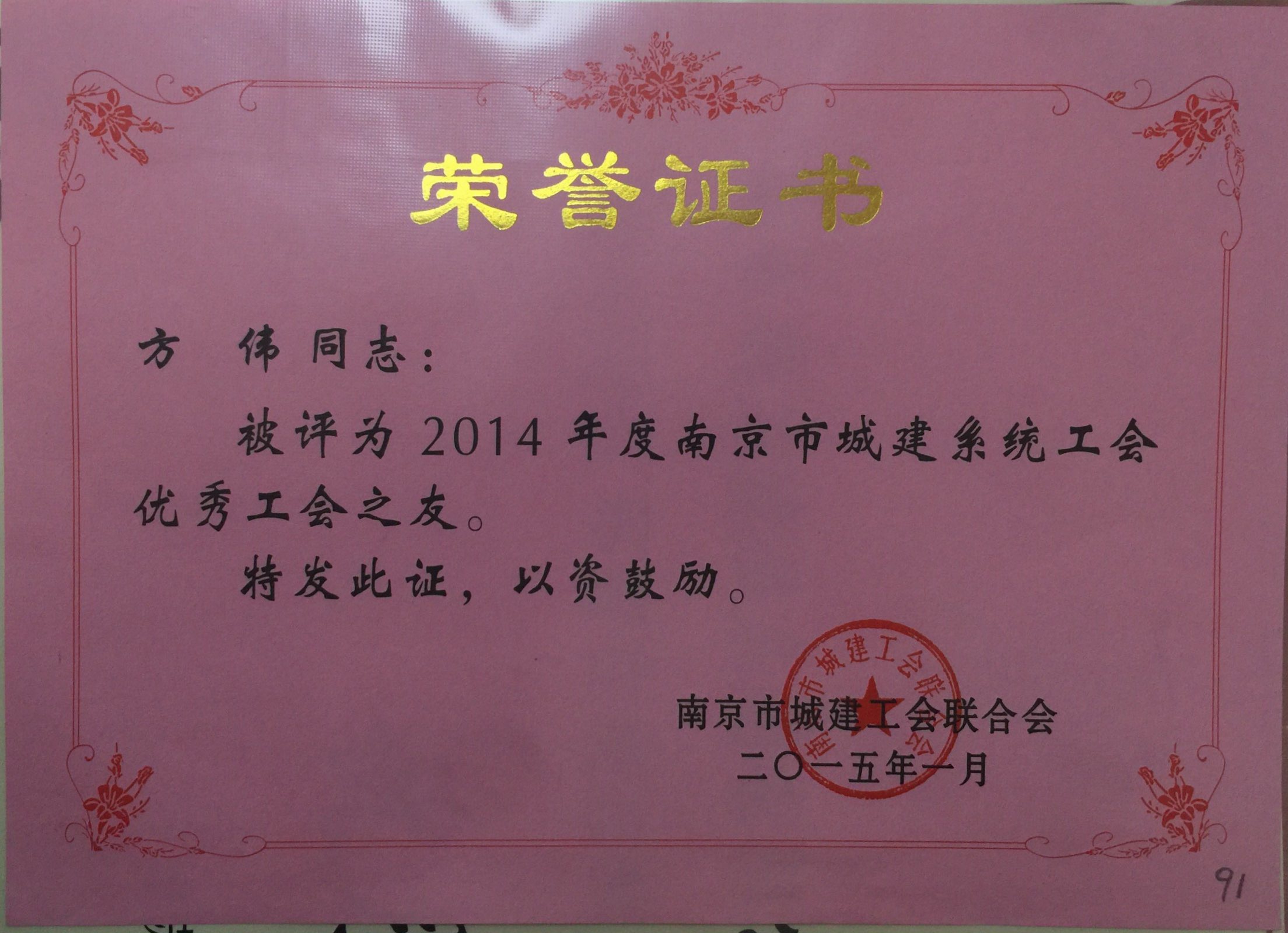 公司方伟被评为2014年度南京市城建系统...