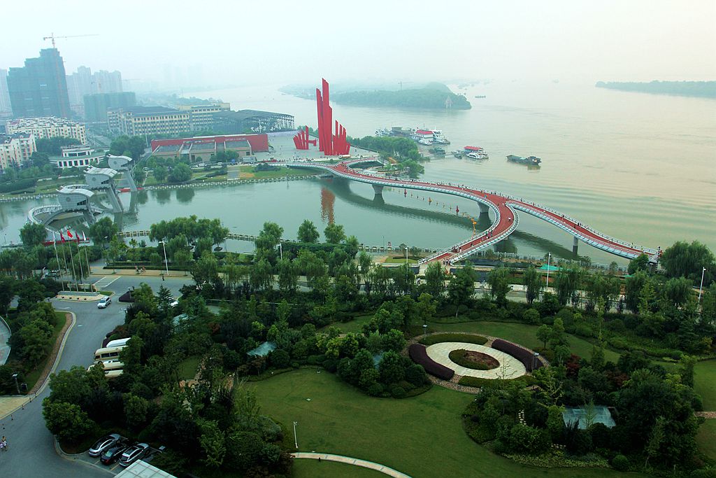 三汊河口人行桥位于外秦淮河的三汊河口闸下游,南起渡江胜利纪念馆广场,北至淮滨路。桥位处河道宽度约200m,河口北侧为世茂滨江新城,南侧为渡江胜利纪念馆和“千帆竞渡”雕塑,桥位东侧约110m为三汊河口闸,东侧约300m为下关大桥。