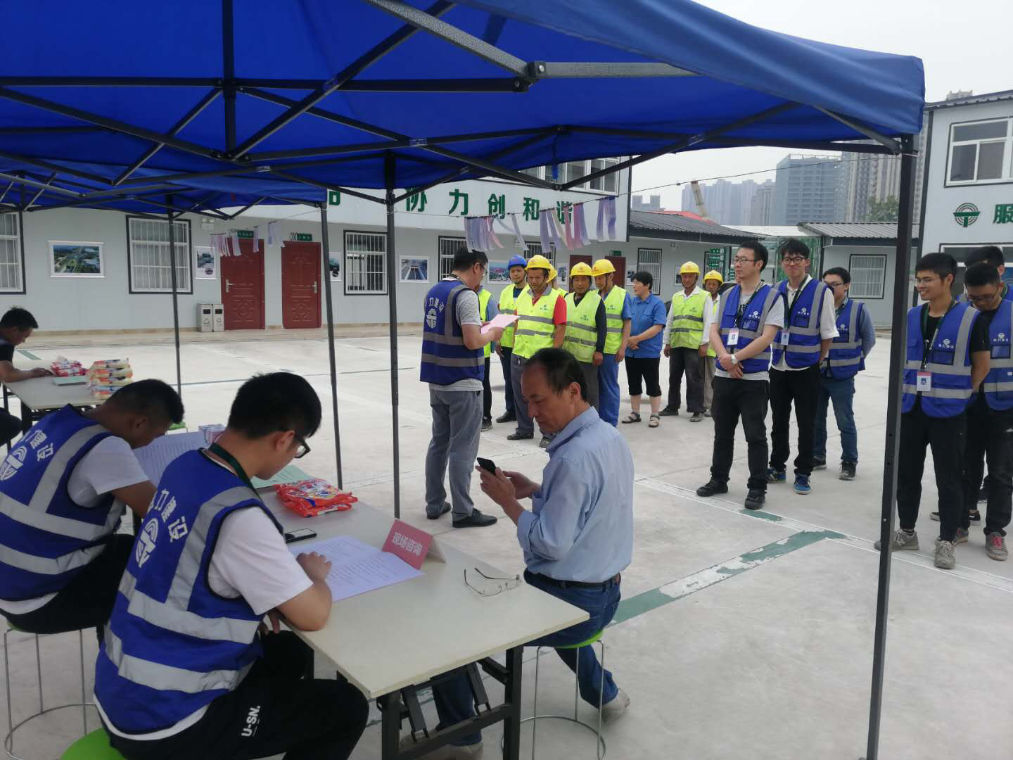 ★施工人员排队参与现场宣传活动