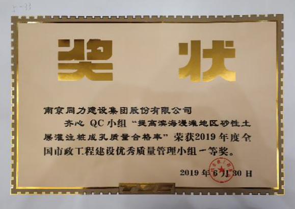 本次发布会上,同力建设参赛的两项QC成果均来自项目施工一线,成果质量水平较高,经过激烈角逐,同力人QC小组的《降低风化岩层三重管高压旋喷桩水泥损耗率》和齐心QC小组的《提高滨海漫滩地区砂性土层灌注桩成孔一次验收合格率》均荣获一等奖,同力建设凭借多年来在QC小组活动中的突出成绩和表现,再次荣获“2019年度全国市政工程建设QC小组活动优秀企业”称号,徐庆平获得“2019年度全国市政工程建设QC小组活动优秀推进者”,此次再获大奖是对同力建设多年来QC小组活动成绩的一种肯定,更激励同力人继续努力开展QC小组活动。