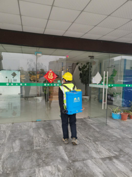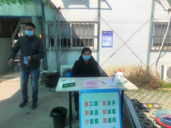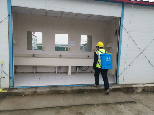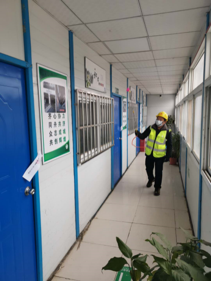 项目部设置疫情检查登记,严格控制人员出入,体温检测逢人必检,详细登记人员信息。为了保证防疫工作落实到位,项目部为留守工作人员派发一次性口罩,同时有专人负责定时对值班室、项目部门厅、办公区域、厨房、卫生间进行消毒。