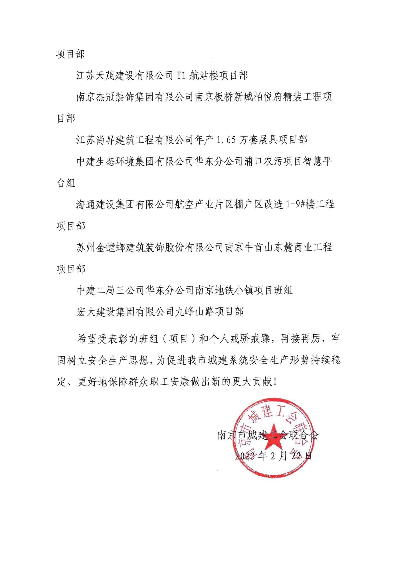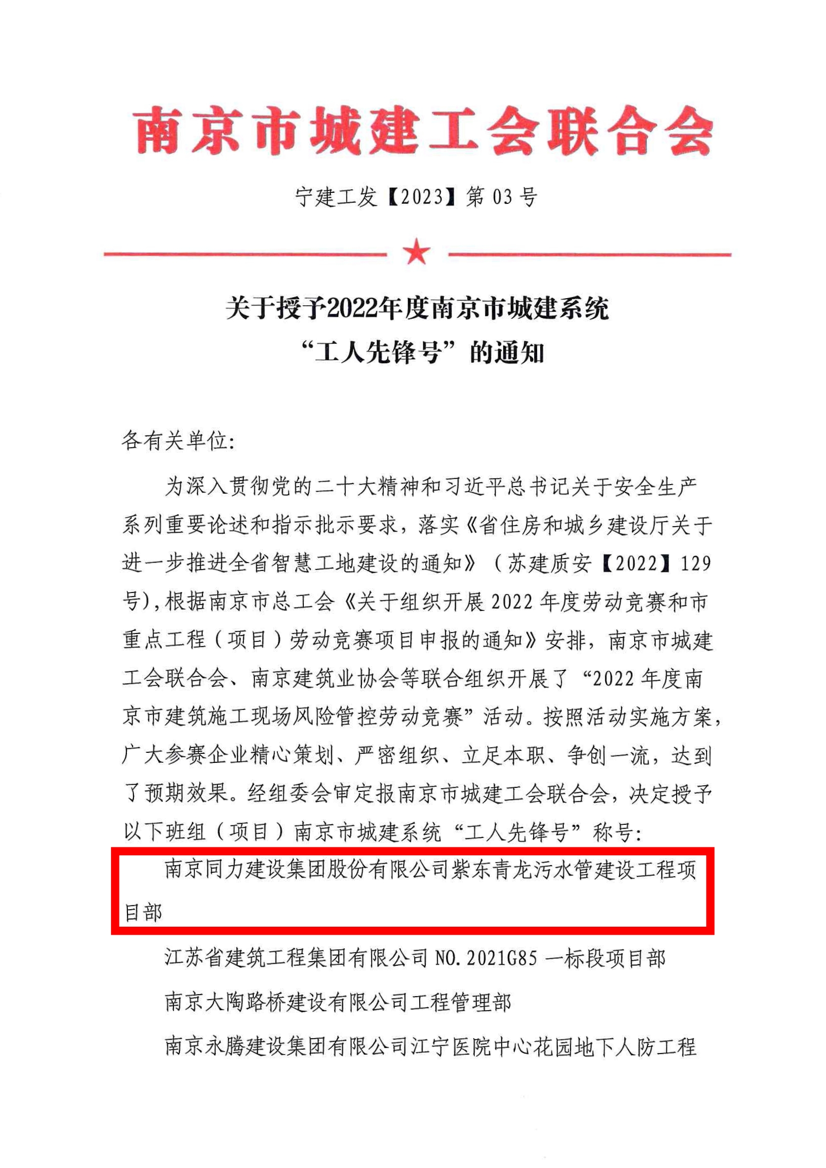 近日,南京市城建工会联合会下发宁建工发[2023]第03号文《关于授予2022年度南京市城建系统“工人先锋号”的通知》,其中完美世界电竞APP紫东青龙污水管建设工程项目部获2022年度南京市城建系统“工人先锋号”称号,继该项目被评选为南京市智慧化工地、南京市差别化工地、南京市水务2021年市级文明工地后获得又一殊荣,提升了企业影响力。